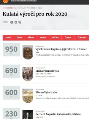 Na rok 2020 připadá více než 50 kulatých výročí, o nichž naleznete bližší informace v příslušných heslech Encyklopedie Prahy 2.