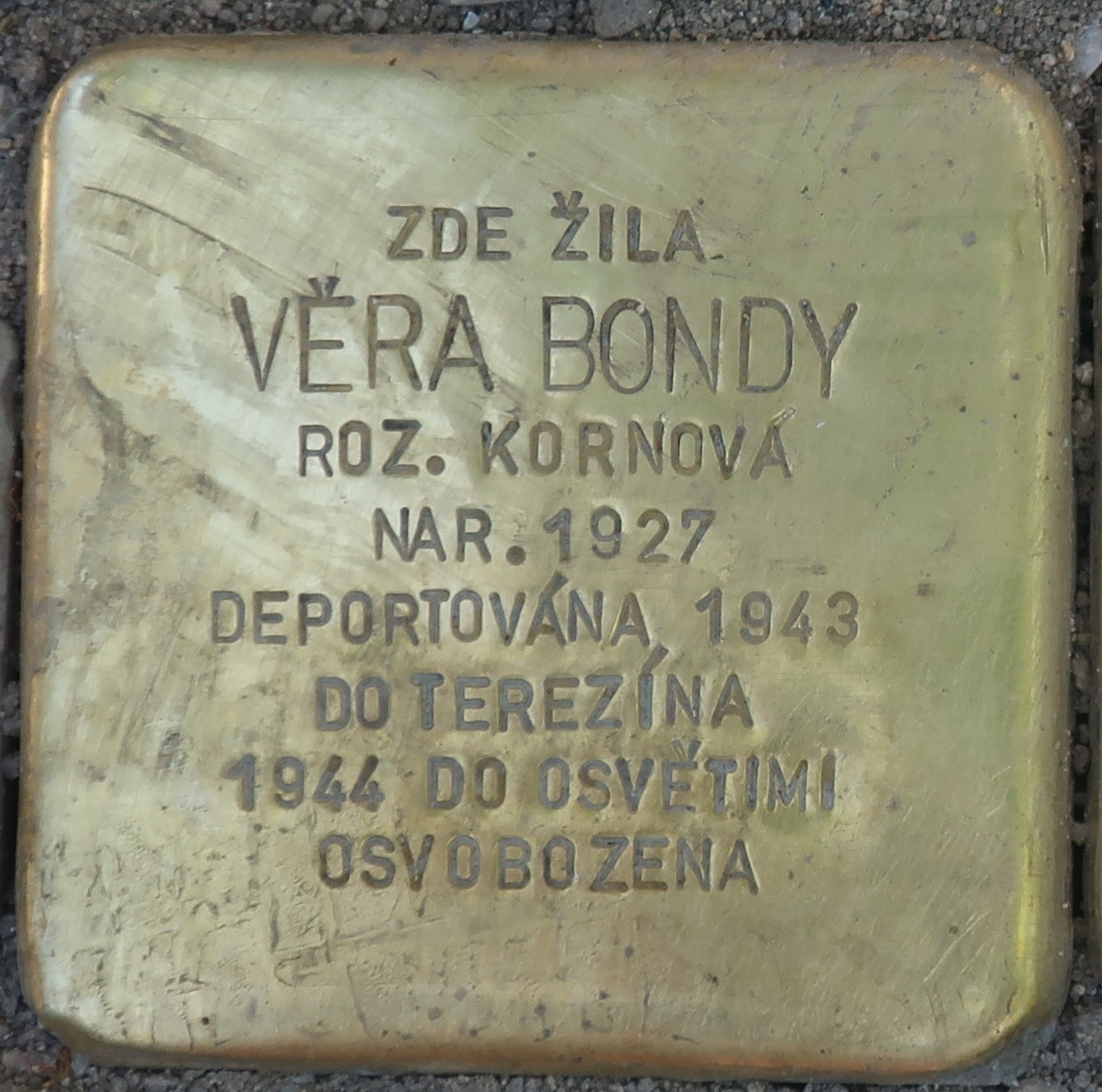 Text na kameni: Zde žila Věra Bondy, roz. Kornová, nar. 1927, deportována 1943 do Terezína, 1944 do Osvětimi, osvobozena