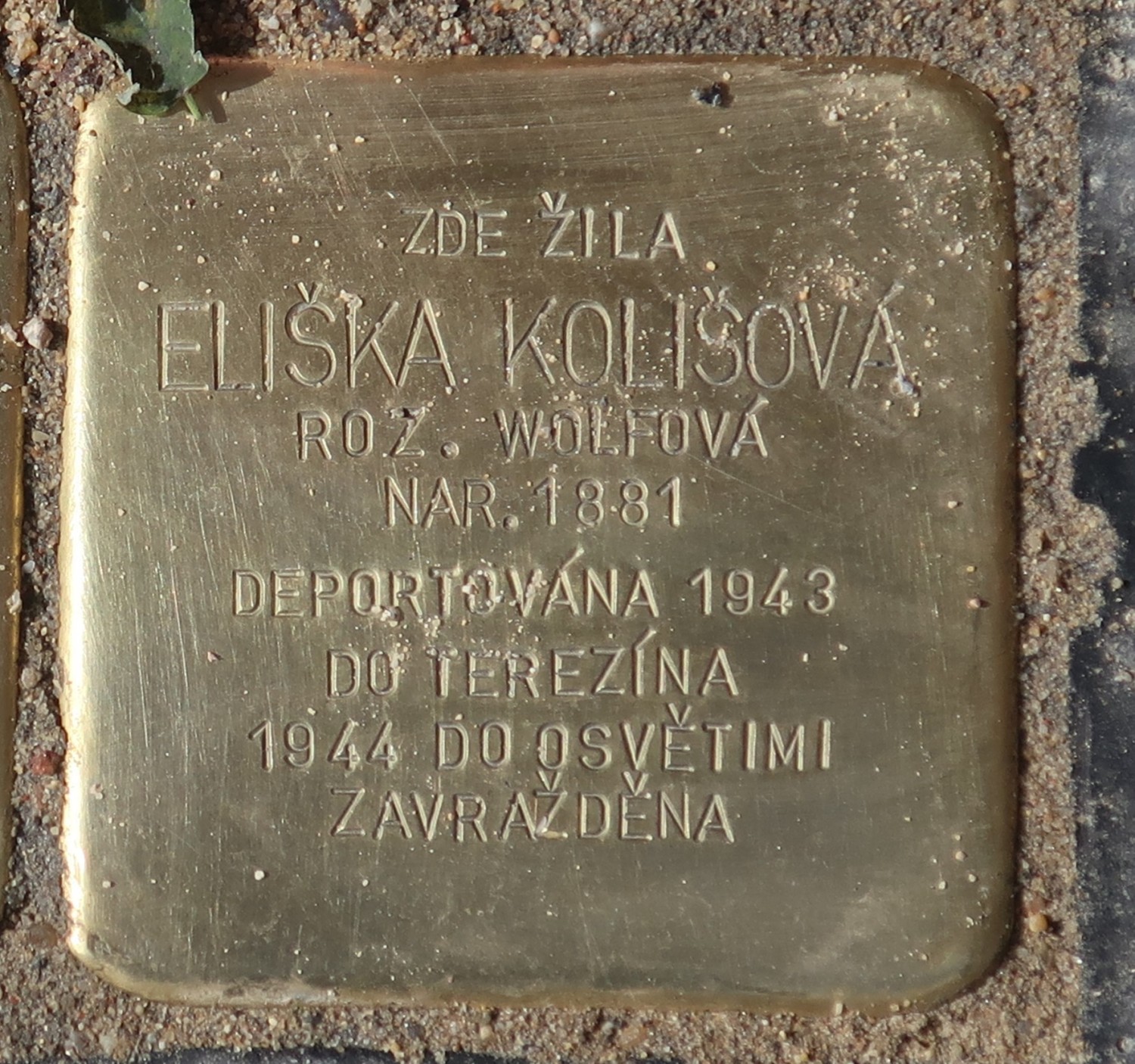 Text na kameni: Zde žila Eliška Kolišová, roz. Wolfová, nar. 1881, deportována 1943 do Terezína, 1944 do Osvětimi, zavražděna.